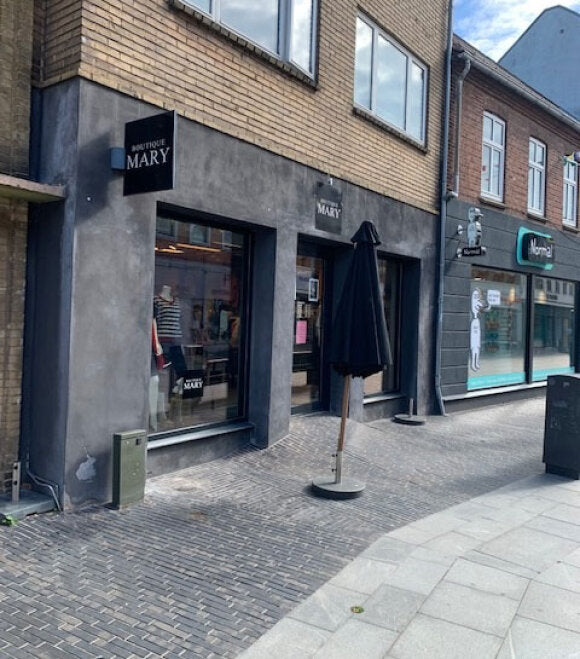 MARY ligger midt på gågaden med Normal butikken som nabo og nem parkering bag butikken.